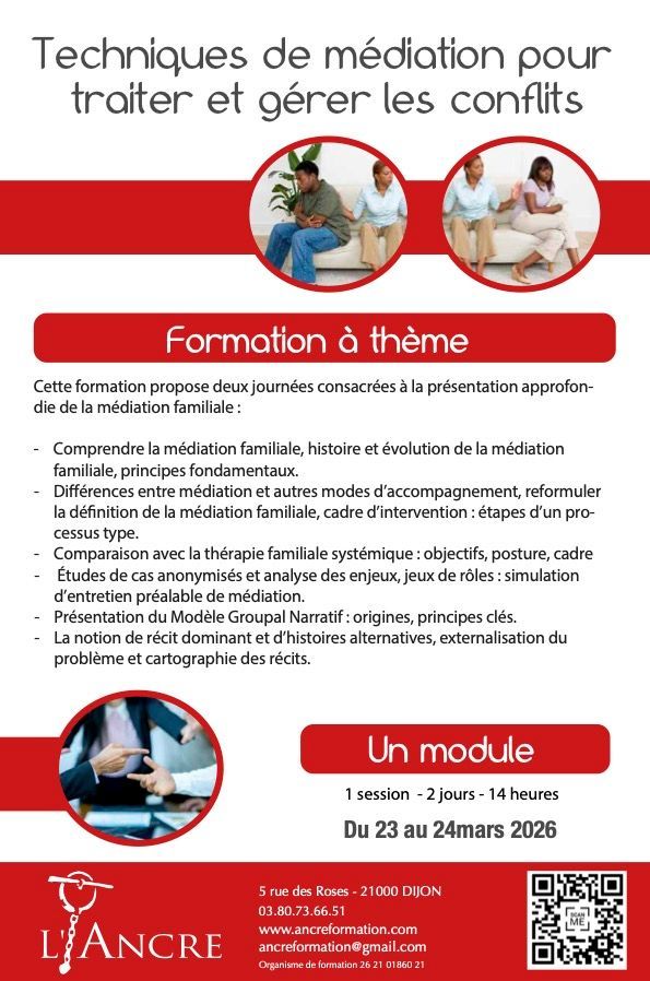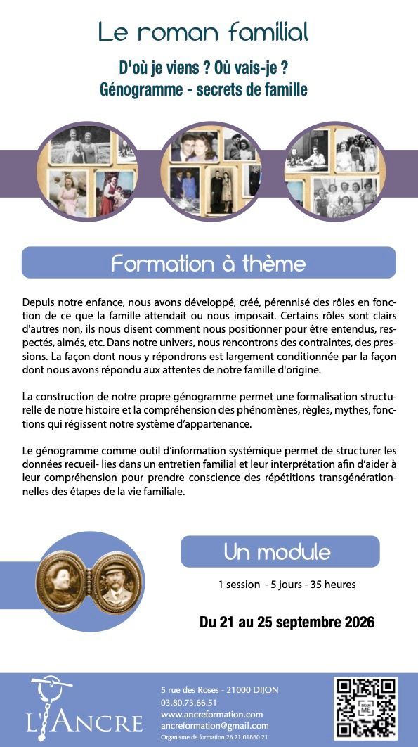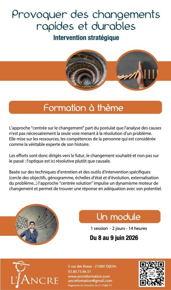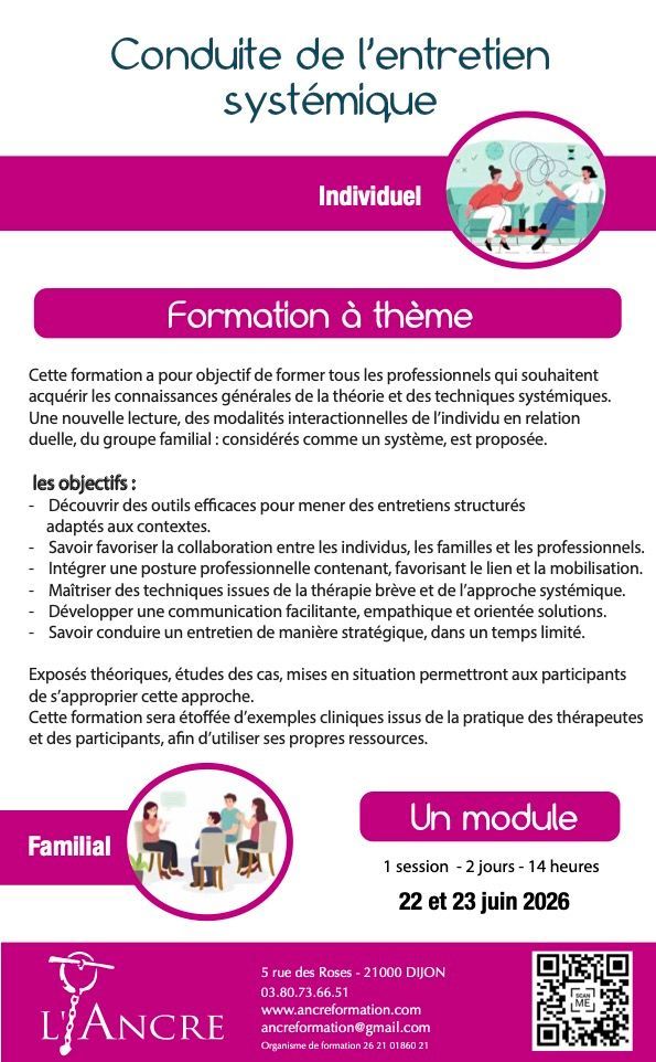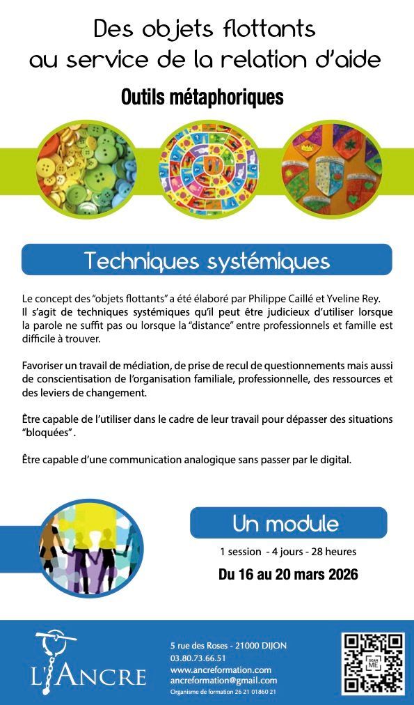 1 session / 35h | Du 21 au 25 septembre 2026 | Lieu : Dijon | En présentiel | Coût 1100 euros | Formateurs de L'Ancre |