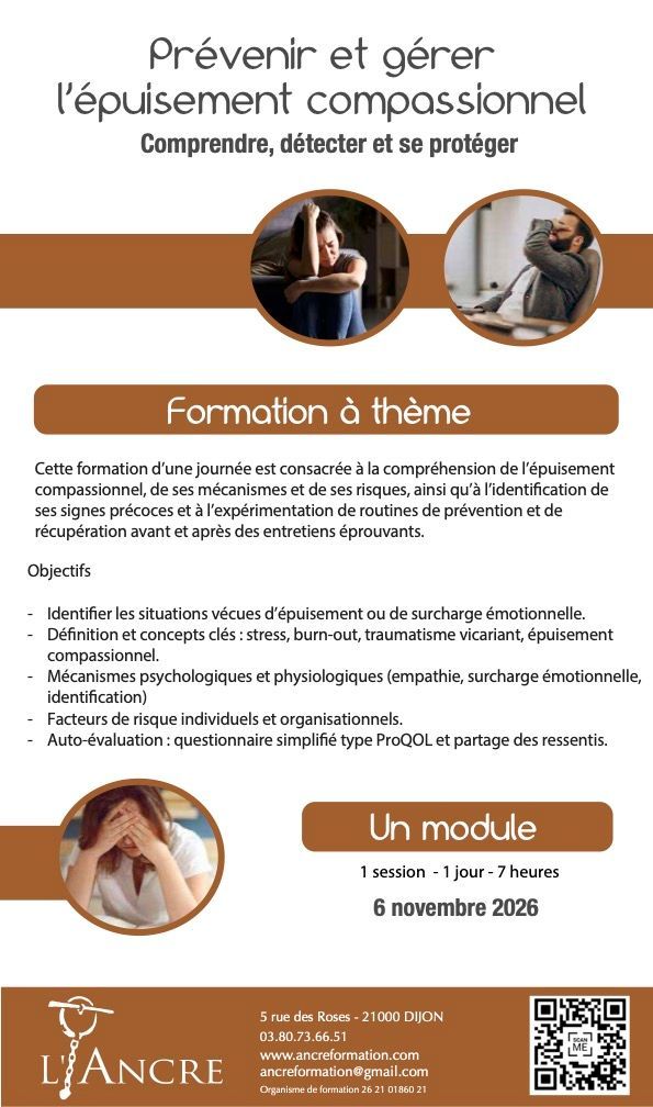 Cette formation d’une journée est consacrée à la compréhension de l’épuisement compassionnel, de ses mécanismes et de ses risques, ainsi qu’à l’identification de ses signes précoces et à l’expérimentation de routines de prévention et de récupération avant et après des entretiens éprouvants. Elle alterne apports théoriques,