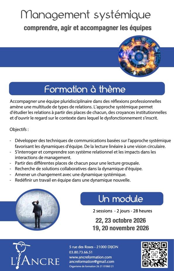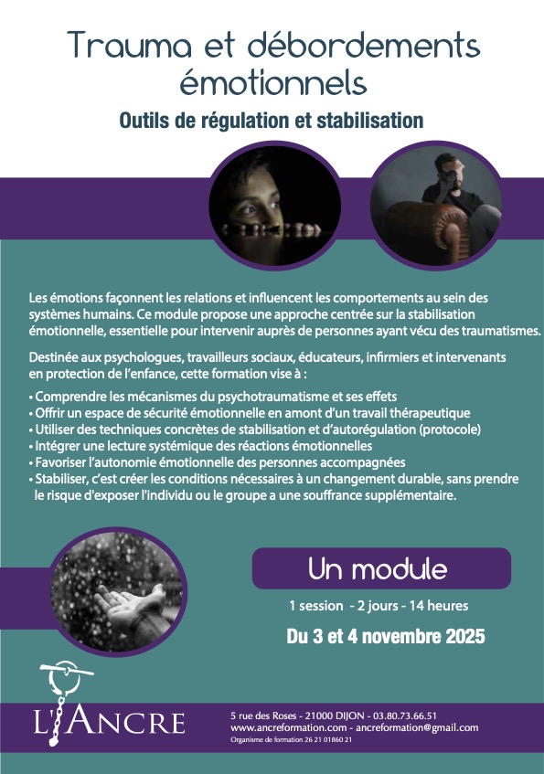 1 session / 35h | Du 21 au 25 septembre 2026 | Lieu : Dijon | En présentiel | Coût 1100 euros | Formateurs de L'Ancre |